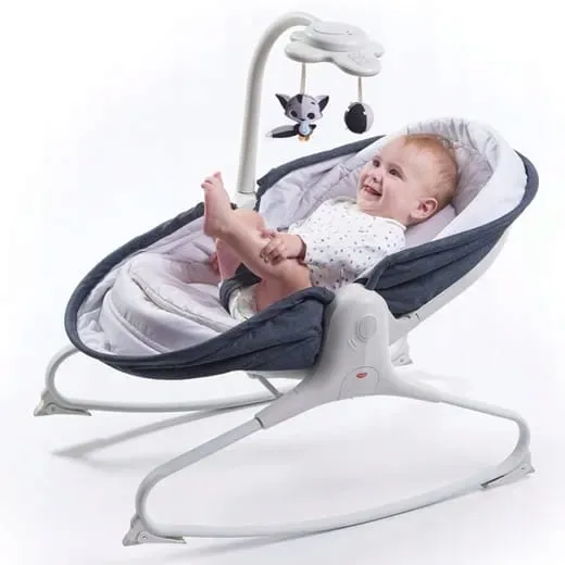 Atrakcyjnym dla dziecka elementem tego wielofunkcyjnego leżaczka jest zabawka świetlno-muzyczna na ruchomym ramieniu, która może zostać aktywowana przez dziecko. Zabawka posiada 9 melodii oraz dwa stopnie głośności. Dźwięk można ustawić w 3 trybach pracy: